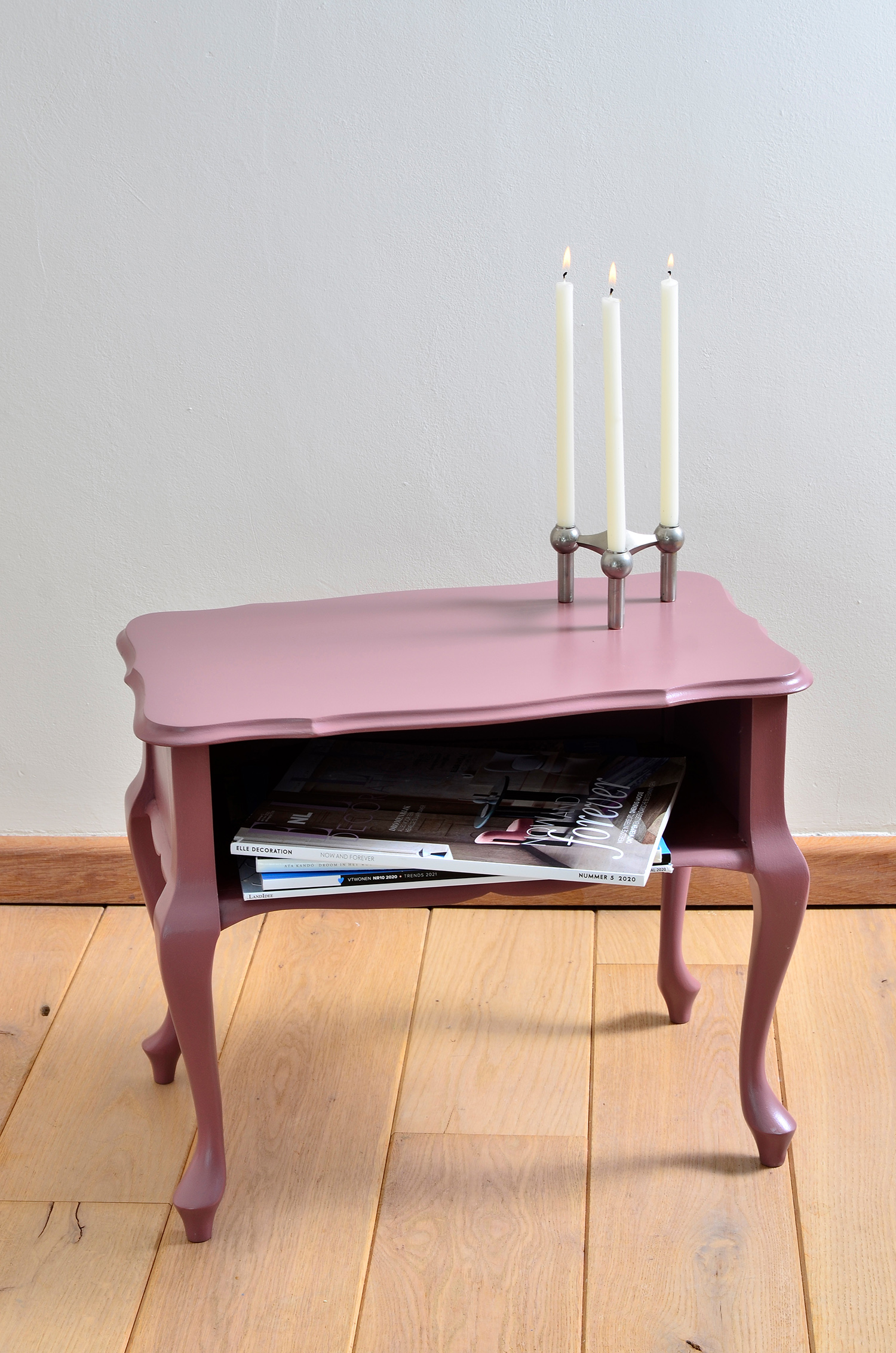 Dit mooie tafeltje met een vak voor tijdschriften of boeken is geschilderd in de kleur Jazz van Histor. Kan natuurlijk ook goed als nachtkastje fungeren.