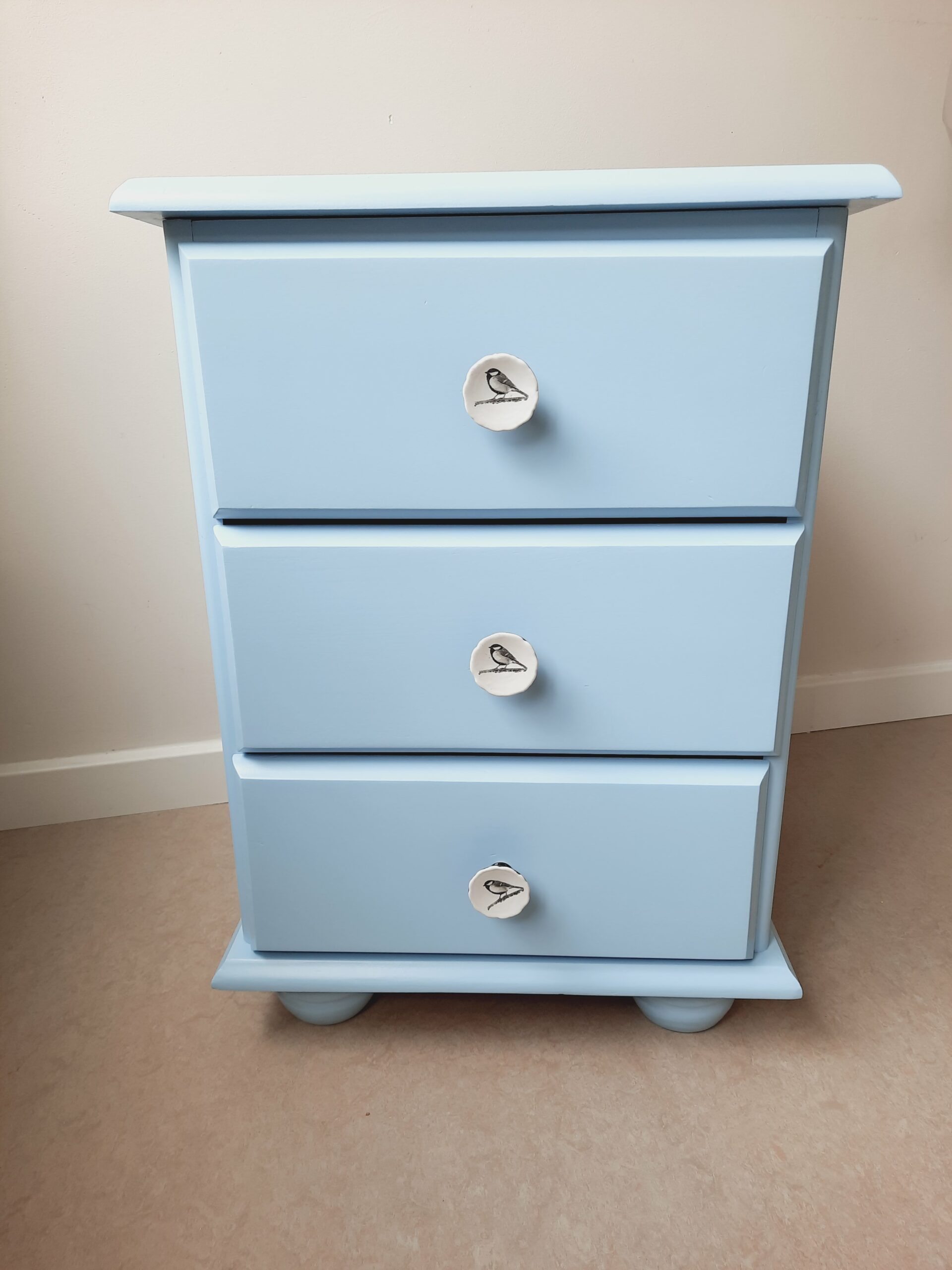 Dit leuke ladenkastje heb ik geschilderd in de kleur Waterman van Histor. De leuke retroknopjes hebben een afbeelding van een vogeltje.
