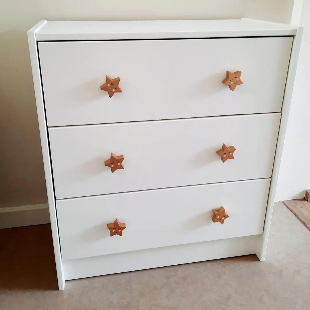 Dit ladenkastje heb ik geschilderd in de kleur RAL 9010, crème-wit van Flexa. Nieuwe kastknopjes in de vorm van ster.